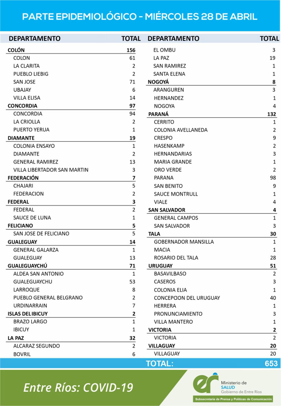 El área de Vigilancia Epidemiológica del Ministerio de Salud, confirmó que en Entre Ríos este miércoles se registraron 653 nuevos casos de coronavirus.