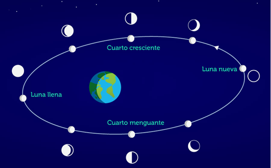 En el siguiente gráfico, se ve la órbita y fases de la Luna: