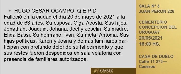 Fúnebres Hugo César Ocampo QEPD mayo 20, 2021 Más Fúnebres Fúnebres Clara Rodriguez Q.E.P.D Fúnebres Nilsa Adela Poetto Q.E.P.D Fúnebres Alcides Miguel Tournour QEPD