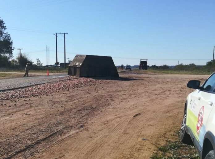 Al parecer se le habría soltado la linga de sujeción del volquete trasero del acoplado, el que cayó sobre invertido sobre la calzada lado sur y parte sobre la banquina sur, desparramando parte de la carga.