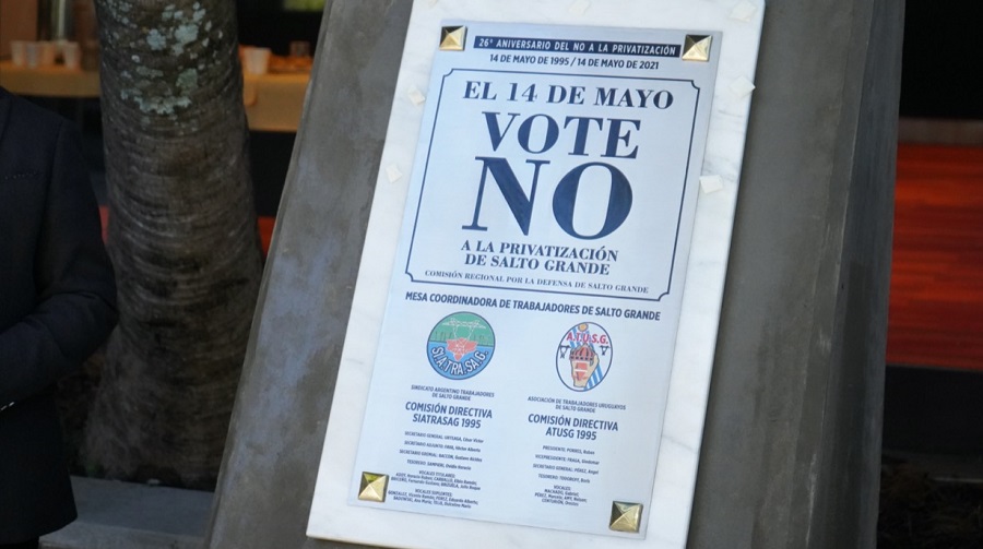 Cabe recordar que el 14 de mayo de 1995, en el marco de una ola privatizadora, los vecinos de la región de Salto Grande en conjunto con los sectores sindicales y políticos se manifestaron en contra de la privatización del ente binacional a través de un plebiscito que concluyó con más del 90% de los votos en contra de las medidas que pretendían dejar en manos de empresarios a la Complejo Hidroeléctrico.
