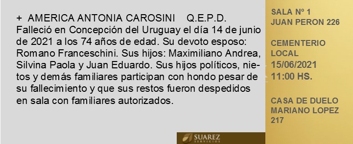 Fúnebres América Antonia Carosini QEPD junio 14, 2021 Más Fúnebres Fúnebres Dorila Lourdes de Amarillo (Lule) Q.E.P.D Fúnebres Clara Rodriguez Q.E.P.D Fúnebres Nilsa Adela Poetto Q.E.P.D
