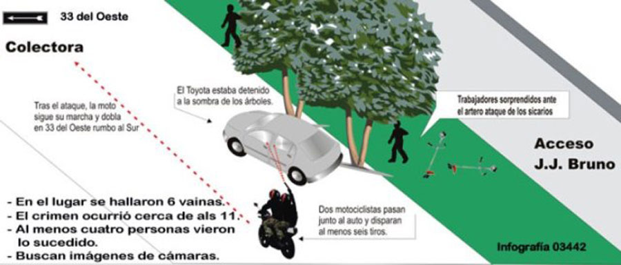 Esa mañana, dos sujetos llegaron en moto y le dispararon a sangre fría, mientras él estaba en el auto Toyota Corolla sobre la colectora Intendente González, entre 32 y 33 del Oeste del acceso Bruno.