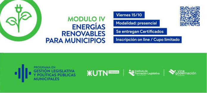 El viernes 15 de octubre a partir de las 09:30 se realizará el cuarto módulo sobre Energías Renovables para Municipios del Programa de Gestión Legislativa y Políticas Públicas Municipales que desarrolla el Instituto de Formación Legislativa de la Vicegobernación. Se dictará de manera presencial y estará a cargo de docentes de la subsede de la Universidad Tecnológica Nacional – Paraná.