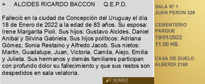 Fúnebres Alcides Ricardo Baccon QEPD enero 18, 2022 Más Fúnebres Fúnebres Lorenzo Eugenio Vouilloud Q.E.P.D Fúnebres JOSÉ “PEPE” GARRO – Q.E.P.D Fúnebres JOSÉ “PEPE” GARRO – Q.E.P.D