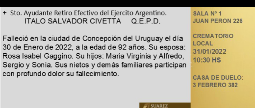 Fúnebres Italo Salvador Civetta enero 30, 2022 Más Fúnebres Fúnebres Lorenzo Eugenio Vouilloud Q.E.P.D Fúnebres JOSÉ “PEPE” GARRO – Q.E.P.D Fúnebres JOSÉ “PEPE” GARRO – Q.E.P.D