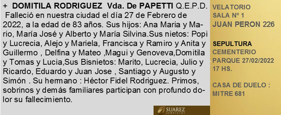 Fúnebres Domitila Rodríguez Vda. de Papetti Q.E.P.D. febrero 27, 2022 Más Fúnebres Fúnebres JOSÉ ERNESTO GARRO “PEPE”. Q.E.P.D Fúnebres Lorenzo Eugenio Vouilloud Q.E.P.D Fúnebres JOSÉ “PEPE” GARRO – Q.E.P.D