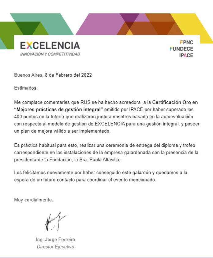 IPACE reconoció a RUS con la Certificación Oro por ser una empresa de calidad y excelencia