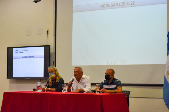 El día martes 8 de febrero se realizó el Acto de Bienvenida para ingresantes 2022 de la Facultad de Ciencias de la Salud, presidido por el Decano, Mg. Jorge Luis Pepe, la Vicedecana Lic. Ema Schuler y el Sec. Académico Mg. Gregorio Etcheverry.