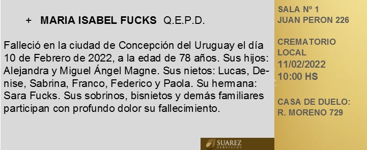 Fúnebres María Isabel Fucks QEPD febrero 10, 2022 Más Fúnebres Fúnebres Lorenzo Eugenio Vouilloud Q.E.P.D Fúnebres JOSÉ “PEPE” GARRO – Q.E.P.D Fúnebres JOSÉ “PEPE” GARRO – Q.E.P.D