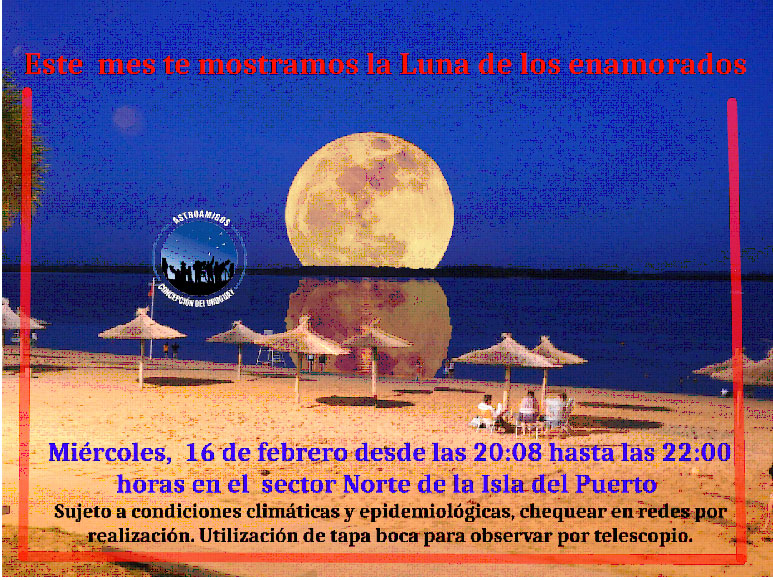 El próximo miércoles, 16 de febrero la Luna estará en fase llena, por lo cual, los Astroamigos de  Concepción del Uruguay tal como lo hicieron en diciembre, quieren compartir su salida sobre el horizonte y reflejándose en el Río de los Pájaros.