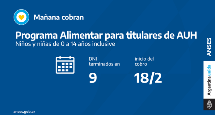 En el marco del Plan Argentina contra el Hambre del Ministerio de Desarrollo Social, ANSES acompaña con el pago del programa Alimentar. Cobran titulares de AUH con documentos terminados en 9 en la misma cuenta de la prestación.