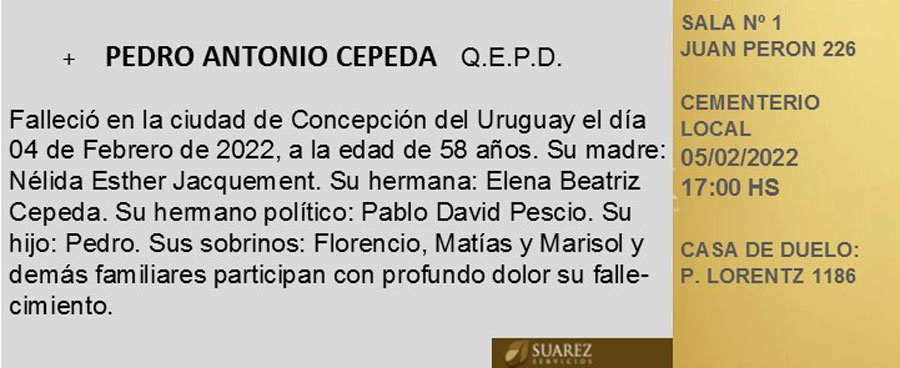 Fúnebres Pedro Antonio Cepeda QEPD febrero 4, 2022 Más Fúnebres Fúnebres Lorenzo Eugenio Vouilloud Q.E.P.D Fúnebres JOSÉ “PEPE” GARRO – Q.E.P.D Fúnebres JOSÉ “PEPE” GARRO – Q.E.P.D