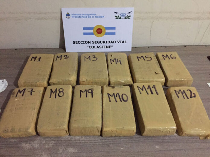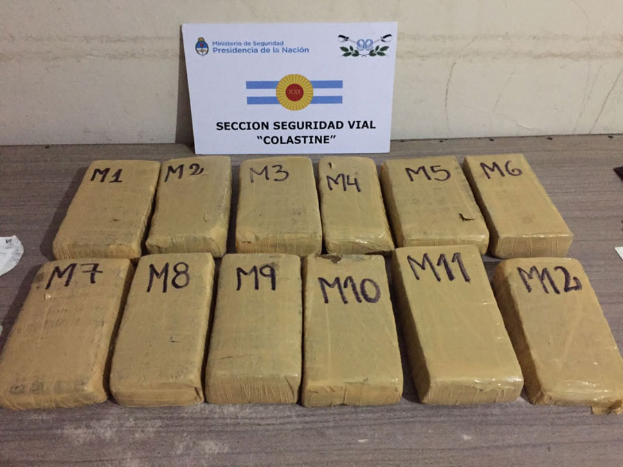 Durante el registro correspondiente del rodado, los gendarmes detectaron 12 paquetes rectangulares distribuidos sobre un asiento delantero y la guantera. Los mismos contenían una sustancia vegetal, la cual fue sometida a prueba de campo Narcotest, arrojando resultado positivo para “cannabis sativa”, con un peso de 14 kilos 210 gramos.