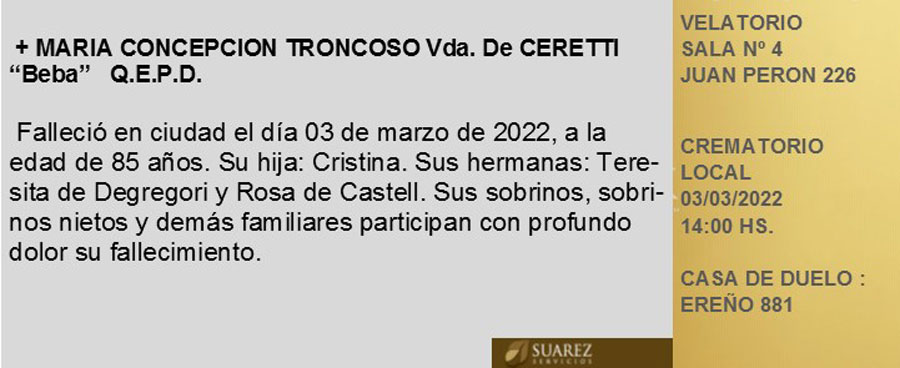 Fúnebres María Concepción Troncoso Vda. de Ceretti QEPD marzo 3, 2022 Más Fúnebres Fúnebres JOSÉ ERNESTO GARRO “PEPE”. Q.E.P.D Fúnebres Lorenzo Eugenio Vouilloud Q.E.P.D Fúnebres JOSÉ “PEPE” GARRO – Q.E.P.D