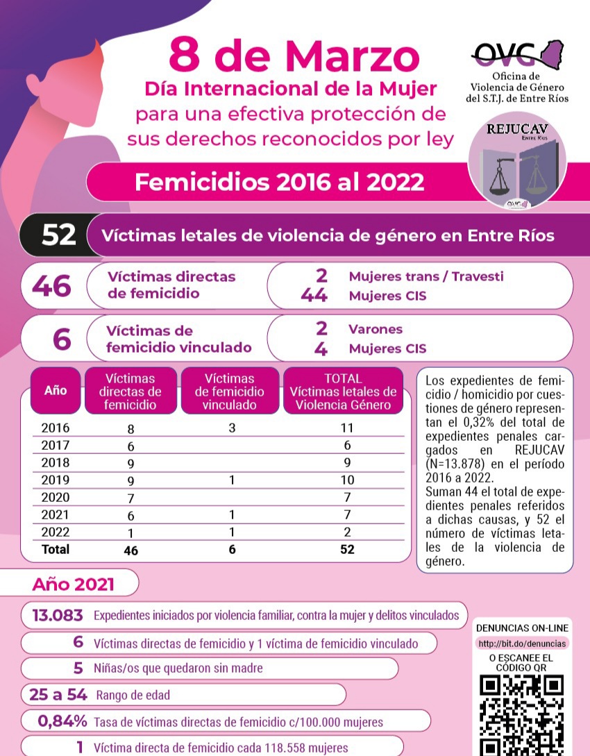 El Registro Judicial de Causas y Antecedentes de Violencia (REJUCAV) de Entre Ríos informó que en el período comprendido entre los años 2016 y 2022 se iniciaron 71.293 denuncias y 11.023 redenuncias por reincidencias. De esos totales, el 42,5% corresponden a violencia familiar; el 38% a violencia contra la mujer y el 19,5% a delitos vinculados a ellas.
