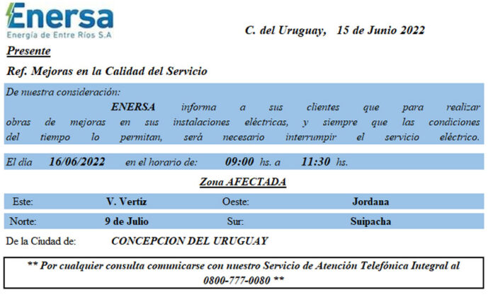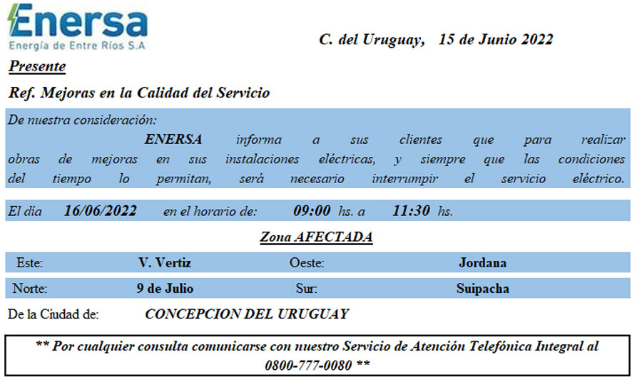 Corte del servicio de energía eléctrica junio 15, 2022 FacebookWhatsAppTwitter ENERSA INFORMÖ OTRO CORTE DEL SERVICIO POR REPARACIONES.