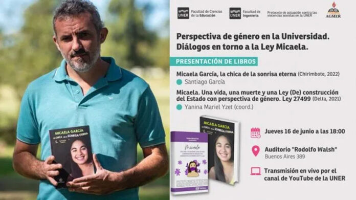 Santiago García nació en Ramos Mejía pero vivió la mayor parte de su vida en Entre Ríos. Es periodista, escritor y docente en escuelas primarias y secundarias. Estudió Comunicación Social en la UNER y trabajó en diversos medios gráficos y radiales de la provincia en los últimos veinte años. Según el autor, se trata de un libro homenaje a Micaela a través de su vida: «Es una forma de hacer Justicia, no sólo por revelar el accionar y la identidad de los asesinos, sino por dar cuenta de los mecanismos que permiten que el #NiUnaMenos siga siendo un horizonte posible pero aún lejano», dice su prólogo.
