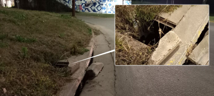 Ese sector, los días de mucha lluvia, se cubre de agua formándose un gran torrente y si alguien intenta cruzarlo caminando por el borde sobre el cordón, puede caer en el pozo.