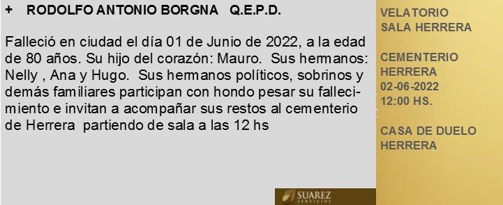 Fúnebres Rodlfo Antonio Borgna QEPD junio 2, 2022 Más Fúnebres Fúnebres Jorge Roberto Fontana QEPD Fúnebres JOSÉ ERNESTO GARRO “PEPE”. Q.E.P.D Fúnebres Lorenzo Eugenio Vouilloud Q.E.P.D