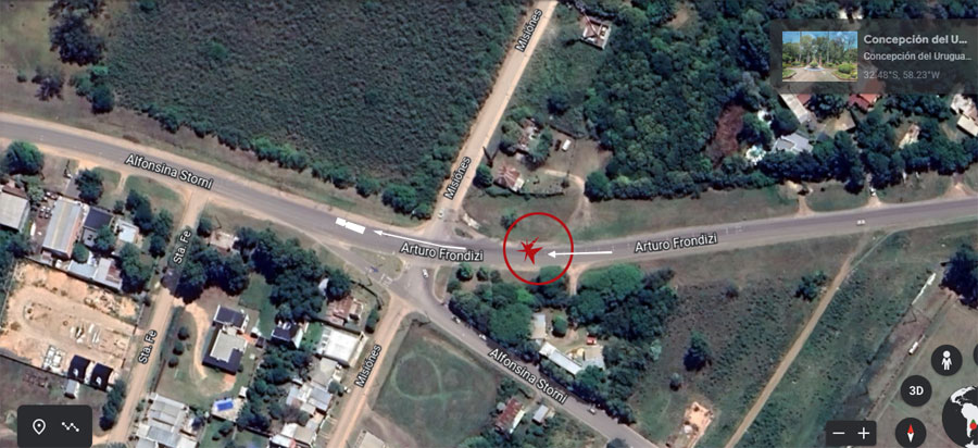 Tal como se informara, el siniestro se produjo a la altura de la cancha del Club Rivadavia, a unos cien metros al este de los semáforos de calle Misiones, cuando el camión Ford Cargo dominio DAR 143, transitaba en dirección al oeste, cuando metros antes de llegar a la intersección mencionada, se le cruzó una persona a la que atropelló y terminó arrollando, deteniendo su marcha varios metros más adelante, al oeste de los semáforos, como e observa en la infografía.