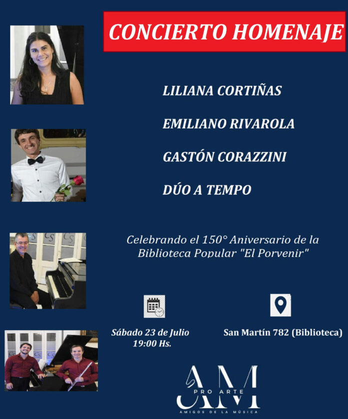 La Asociación Pro Arte Amigos de la Música continúa la Temporada 2022 con un Concierto Homenaje a la Biblioteca Popular “El Porvenir”, en su 150° Aniversario a cargo de los músicos locales Liliana Cortiñas, Carlos Arrizabalaga, Sebastián Amarillo, Gastón Corazzini y Emiliano Rivarola. El mismo tendrá lugar el próximo sábado 23 de julio a las 19:00 Hs. en la Biblioteca Popular misma (San Martin 782) de nuestra ciudad.