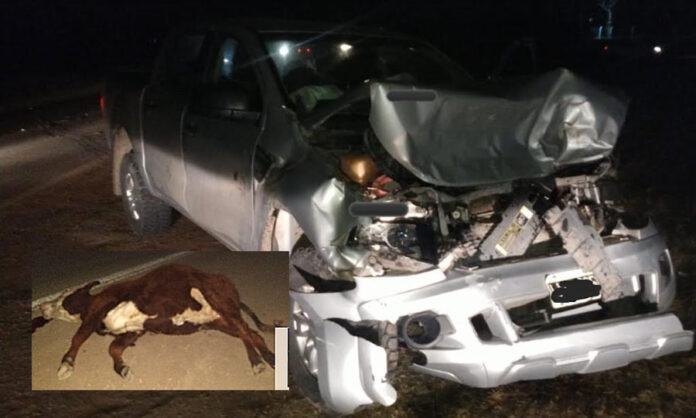 El vehículo circulaba en dirección al este ingresando a la ciudad de Colón, cuando se le cruzaron repentinamente dos animales vacunos, que fueron impactados por el rodado, lo que le causó la muerte a uno quedando el segundo animal mal herido.