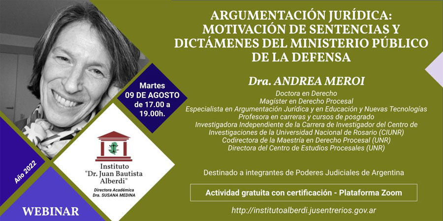El 9 de agosto, de 17 a 19, el Instituto de Formación y Perfeccionamiento Judicial “Dr. Juan Bautista Alberdi” dictará una capacitación titulada “Argumentación jurídica: motivación de sentencias y dictámenes del Ministerio Público de la Defensa”.