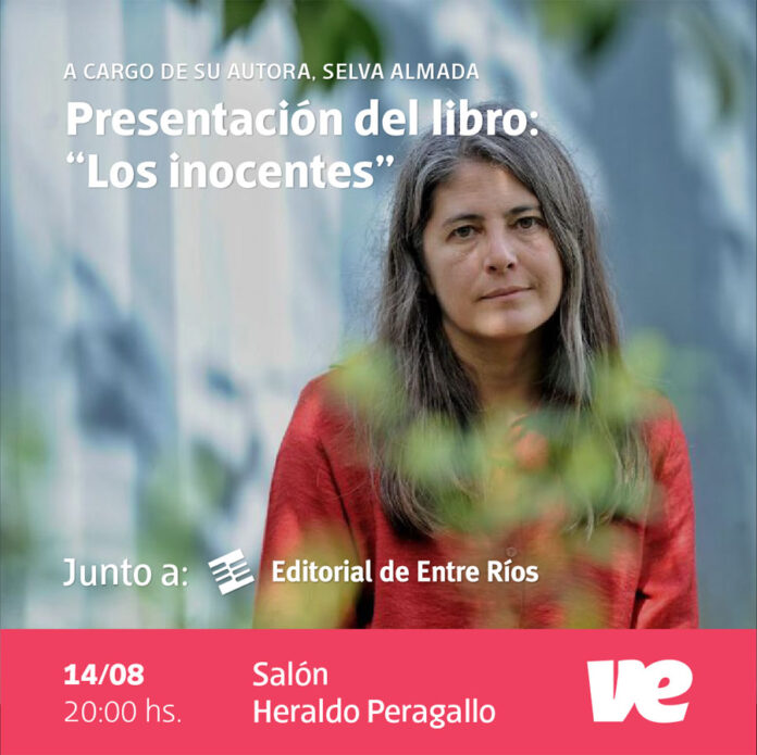 El viernes 12 de agosto, a las 20 horas, se llevará a cabo en el Salón Heraldo N. Peragallo la presentación del libro “Los inocentes” de la escritora Selva Almada. La actividad, libre y gratuita, es organizada por el Área municipal de Cultura y Educación junto a la Editorial de Entre Ríos.⁣