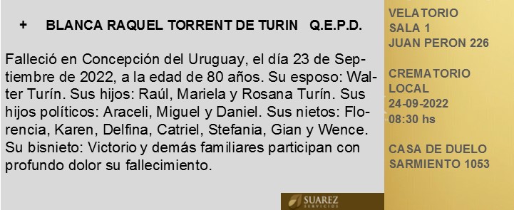 Fúnebres Blanca Raquel Torrent de Turin QEPD septiembre 23, 2022 Más Fúnebres Fúnebres Jorge Roberto Fontana QEPD Fúnebres JOSÉ ERNESTO GARRO “PEPE”. Q.E.P.D Fúnebres Lorenzo Eugenio Vouilloud Q.E.P.D