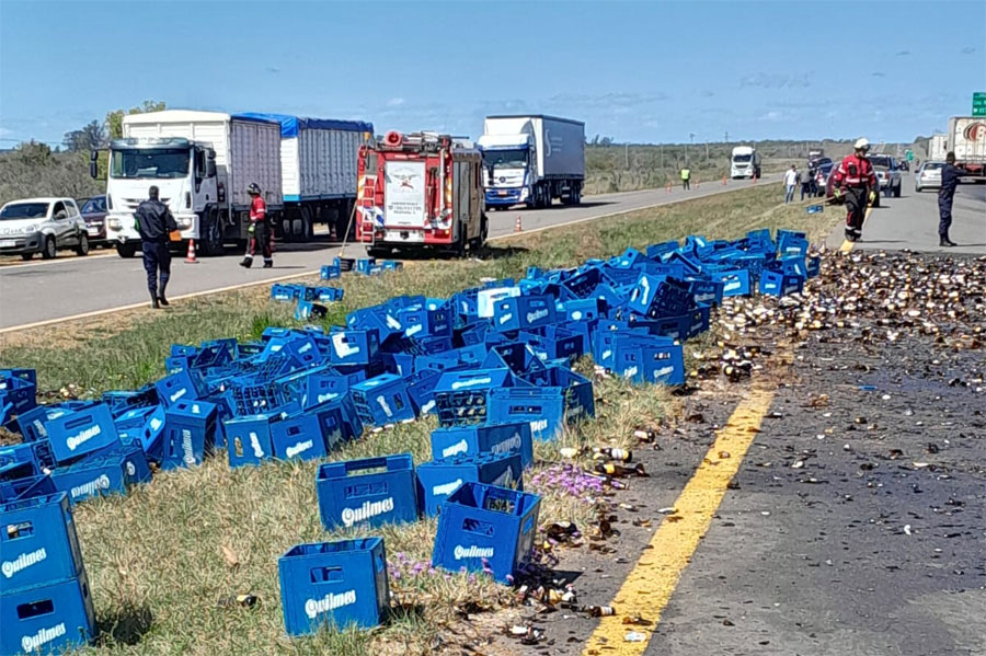 Serias pérdidas materiales se registraron a raíz de un siniestro vial en el cual intervinieron un auto y un camión cargado con cajones de cerveza, ocurrido este miércoles cerca e las 11:30 horas en el kilómetro 318 de la Autovía Artigas (Nacional 14).