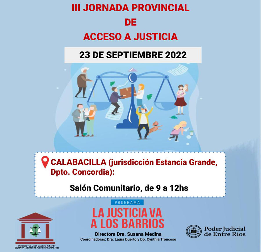 Desde el Ejecutivo Municipal, se realizó el pedido formal a la Presidenta del Superior Tribunal de Justicia, Dra. Susana Medina solicitando que el programa «La justicia va a los barrios» se haga presente para toda la comunidad de Estancia Grande, Puerto Yeruá y zonas aledañas, llegando este viernes 23 de setiembre de 9 a 12 hs en el Salón Municipal de la delegación Calabacilla.