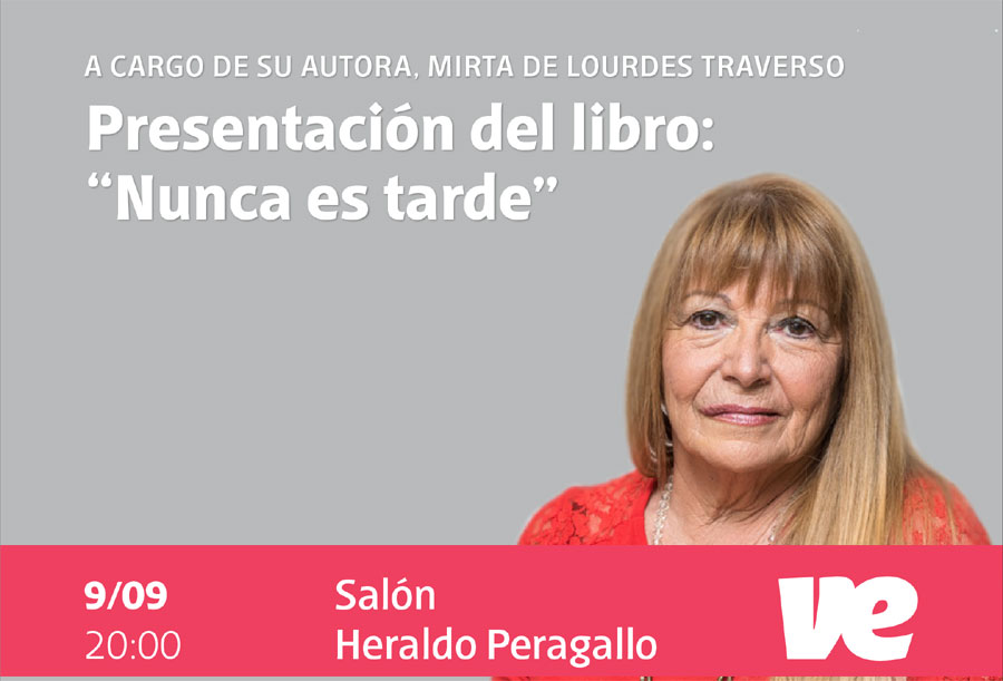 El próximo viernes 9 de septiembre la escritora uruguayense Mirta de Lourdes Traverso presentará en Villa Elisa su libro “Nunca es tarde”.