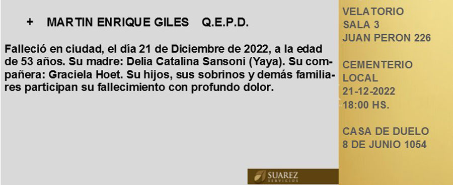 Fúnebres MARTIN ENRIQUE GILES QEPD diciembre 21, 2022 Más Fúnebres Fúnebres Justo Rufino Conde Q.E.P.D Fúnebres Justo Rufino Conde Q.E.P.D Fúnebres Jorge Roberto Fontana QEPD