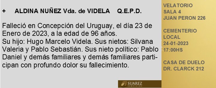 Fúnebres Aldina Núñez vda. de Videla enero 23, 2023 Más Fúnebres Fúnebres Ovidio A. Gianera QEPD Fúnebres Justo Rufino Conde Q.E.P.D Fúnebres Justo Rufino Conde Q.E.P.D