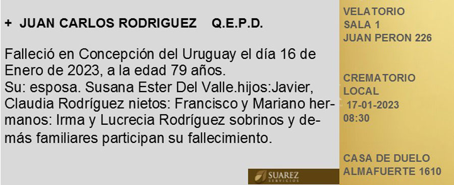 Fúnebres JUAN CARLOS RODRIGUEZ QEPD enero 16, 2023 Más Fúnebres Fúnebres Justo Rufino Conde Q.E.P.D Fúnebres Justo Rufino Conde Q.E.P.D Fúnebres Jorge Roberto Fontana QEPD