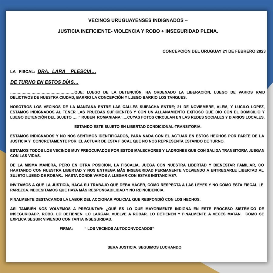 Esto llevó a que vecinos del Barrio La Concepción, vieran con alarma que este individuo segía libre y realizaran una nota dirigida a la fiscal, afirmando que «luego de la detención, ha ordenado la liberación, luego de su raid delictivo en el Barrio La Concepción y Los Tanques. Necesitamos que haya más responsabilidad y empatía».