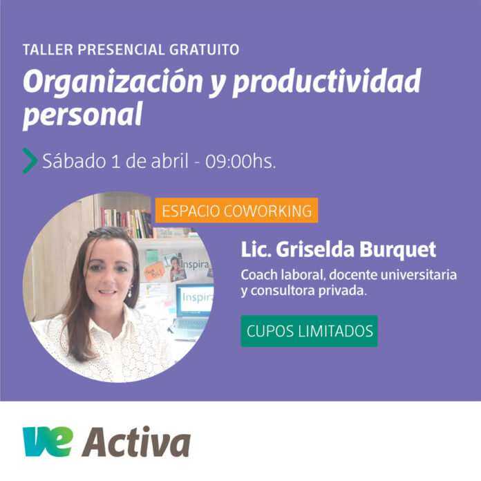 Este taller denominado “Organización y productividad personal” tendrá una duración de dos horas y media (de 9 a 11:30), será gratuito y estará coordinado por la Lic. Griselda Burquet, coach laboral, docente universitaria y consultora privada.
