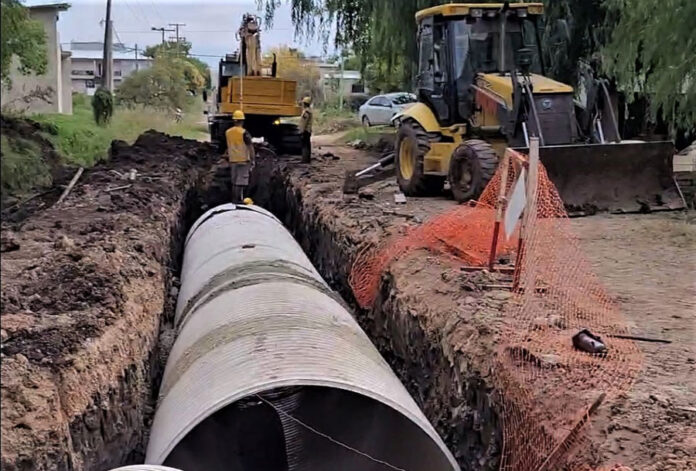 Por otro lado, simultáneamente con la obra de cordón cuneta, sigue la ejecución de trabajos en barrio Tiro Sur. En el marco del plan RENABAP se inició con el entubamiento pluvial en la zona Evita y Vieytes.