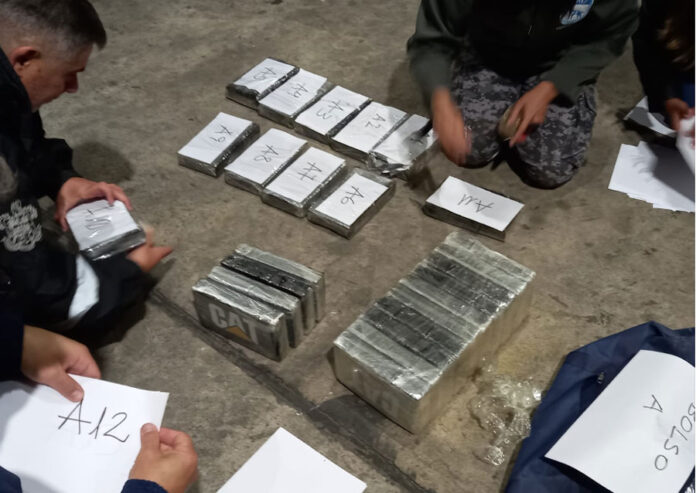 En efecto, al abrirlo encontraron tres bolsos de tela azul que en su interior contenían 73 paquetes cubiertos con papel film, con la inscripción de la marca “CAT” —eran 78,700 kg de cocaína, cuyo valor estimado asciende a USD 1.182.000. La Dirección General de Aduanas presentó la debida denuncia e intervino el Juzgado Federal de Primera Instancia de Campana, a cargo del Dr. Adrián González Charvay.