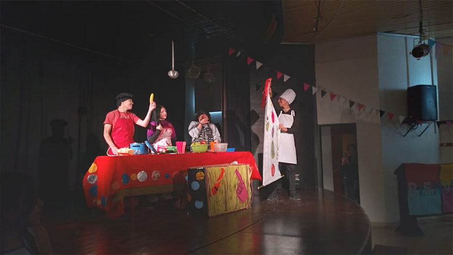 En esta oportunidad, se presentó la obra «Aventuras en la Cocina» a cargo de alumnos de cuarto y quinto año de la Orientación en Artes de la Escuela Normal Superior «Dr. Luis C. Ingold» de nuestra ciudad, acompañados por los profesores Marcela Mesaros, Iván Pastorini y Esteban López.