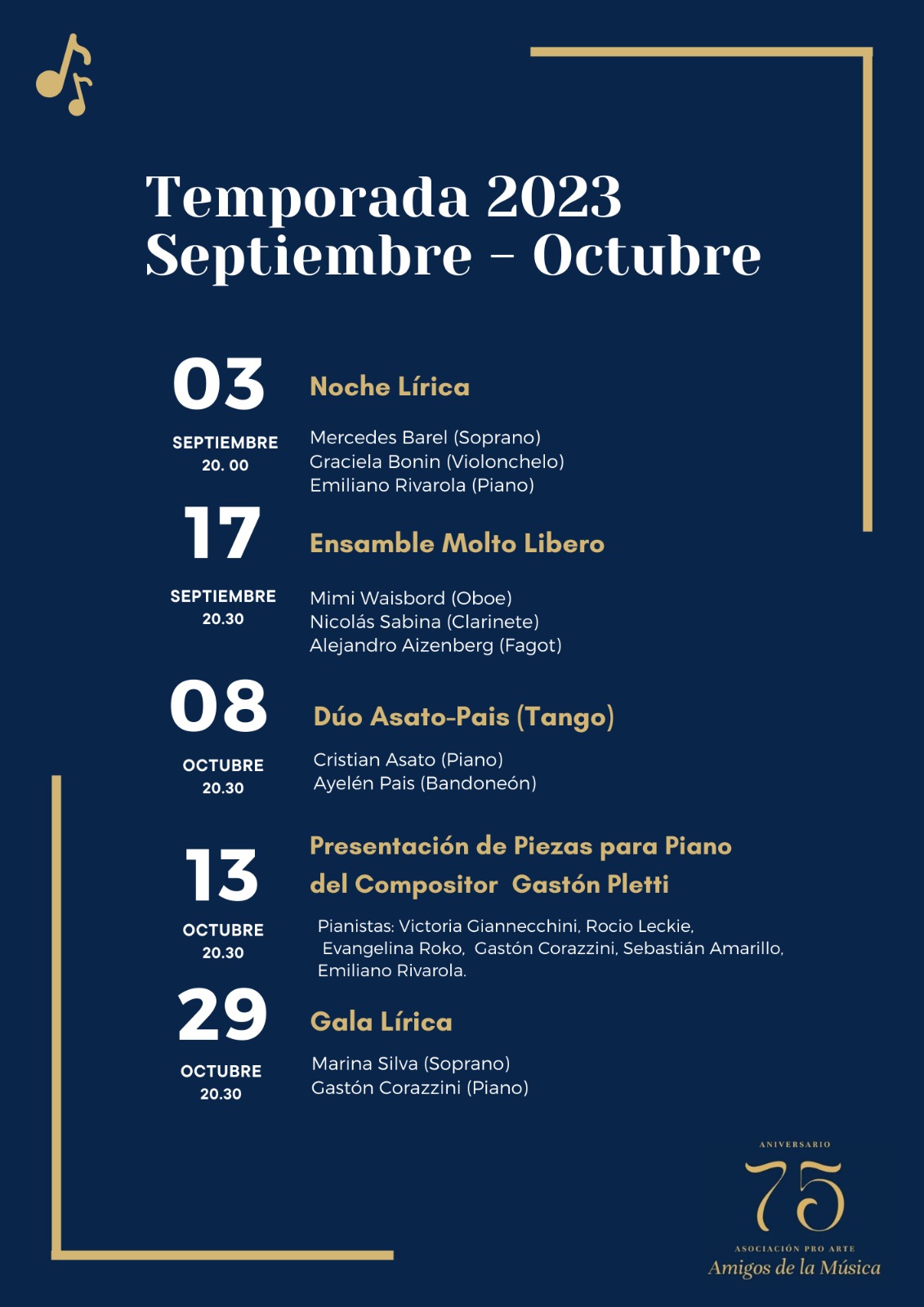 Asociación Pro Arte Amigos de la Música agosto 28, 2023 FacebookWhatsAppTwitter Este año es muy especial para la Asociación Pro Arte Amigos de la Música, ya que cumple 75 años de existencia. Por ello, dieron a conocer el calendario de las próximas fechas confirmadas.