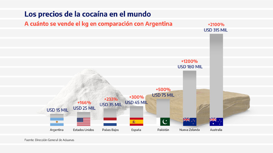 Especialistas en narcotráfico de la Aduana aseguran que esa cantidad droga podría haberse vendido a 600 mil euros en Australia, más de 20 veces el valor que tiene en la Argentina, donde se estima que el precio del kilogramo de máxima pureza ronda los USD 15 mil.