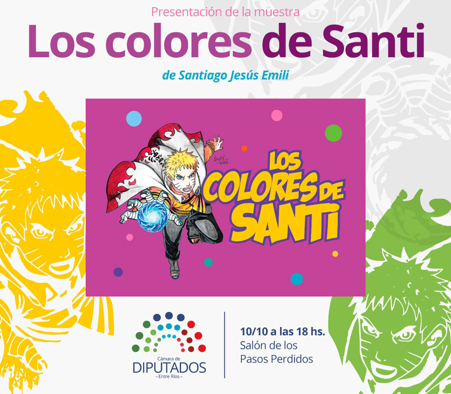 Este martes a las 18 hs. se realizará en el Salón de los Pasos Perdidos la muestra Los Colores de Santi. Se expondrá la obra plástica que consiste en dibujos realizados por el artista entrerriano Santiago Emili, quien fue diagnosticado de Sarcoma de Ewing y falleció a los 17 años en el Hospital San Roque de Paraná.