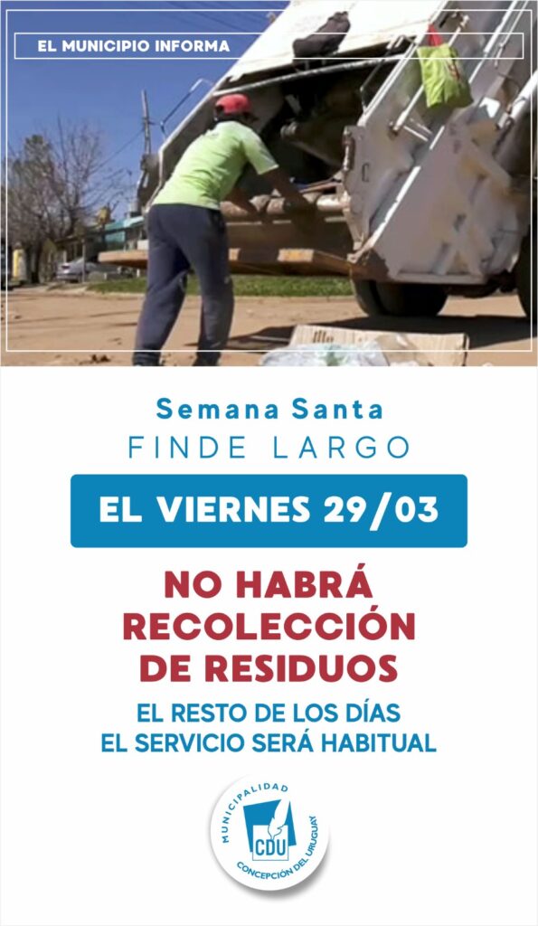En el marco de la celebración religiosa y cultural de Semana Santa, y el feriado puente por el Día del Veterano y de los Caídos en la Guerra de Malvinas, la Municipalidad de Concepción del Uruguay informa sobre el esquema de recolección de residuos.