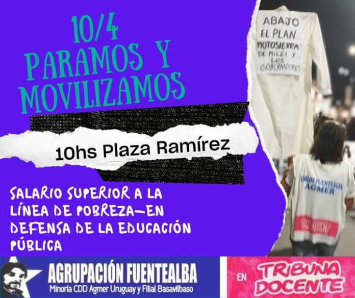 En el marco del paro de AGMER convocado para este miércoles 10/4, desde la minoría de AGMER Uruguay por la Fuentealba concentramos y movilizamos a las 10hs en Plaza Ramírez.