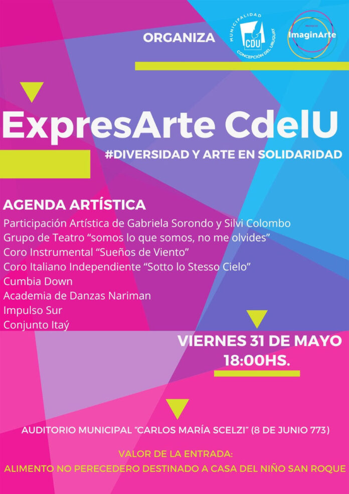 «ExpresArte Cdelu: diversidad y arte en solidaridad, contará con la participación de diversos artistas locales, quienes compartirán su talento y creatividad en un escenario que celebra la diversidad y la inclusión. El evento contará con la participación artística de Gabriela Sorondo y Silvi Colombo; el grupo de teatro “Somos lo que somos, no me olvides”; el Coro “Instrumental Sueños de Viento”; el Coro Italiano Independiente “Sotto lo Stesso Cielo”; Cumbia Down; Academia de Danzas Nariman, Impulso Sur y el Conjunto Itaý.