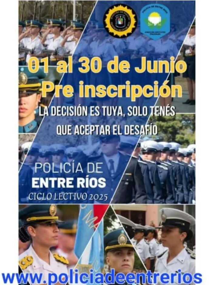 La Dirección Institutos Policiales, dependiente de la Policía de la Provincia de Entre Ríos informa a la comunidad que desde el próximo 1° y hasta el 30 de junio del corriente año, se abren las inscripciones para ingresar a las distintas carreras, con régimen de internado, que ofrecen las Escuelas de Policías, siendo: