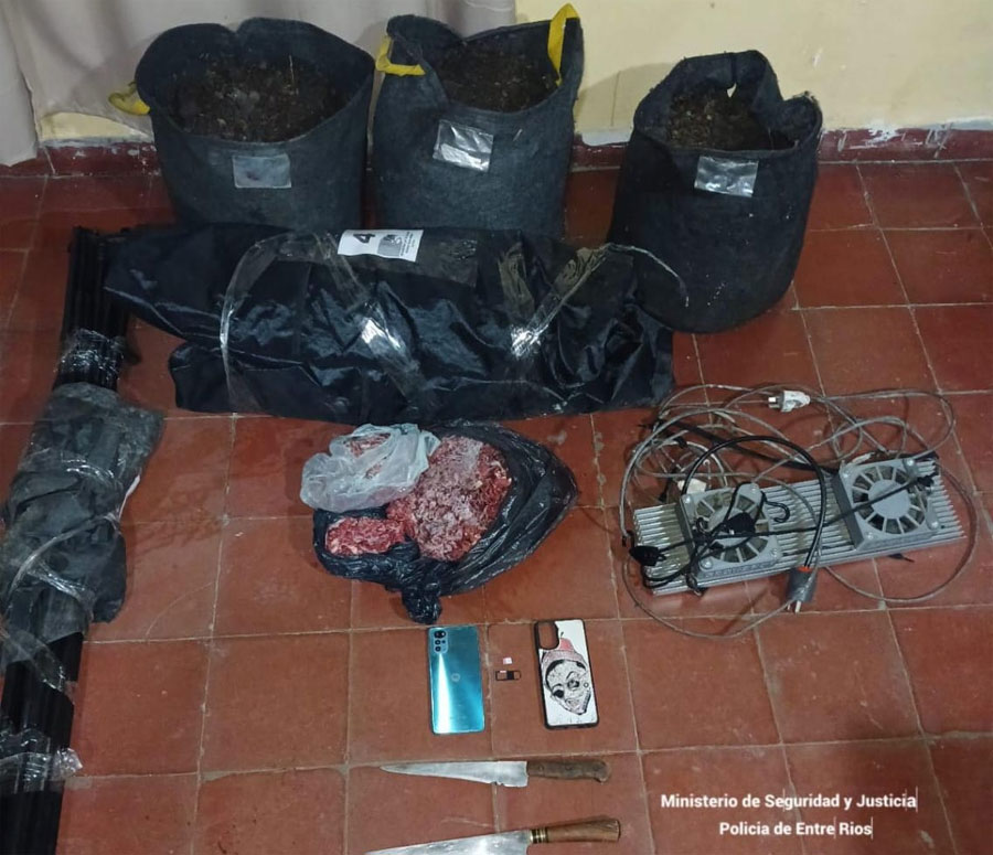 En el allanamiento y registro domiciliario, se hallaron e incautaron varios elementos de interés para la investigación, (tres cuchillos con rastros de sangre, cortes cárnicos y patas de animal vacuno que, por su morfología y pelaje, coincidían con el animal carneado) y un teléfono celular para su análisis que fueron puestos a disposición de la Fiscalía, pero además los funcionarios descubrieron un invernadero con macetas y plantines de cannabis sativa, así como balanzas de precisión.