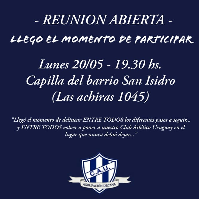 Esta noche, a las 20, en el salón de la Capilla del Barrio San Isidro, sito en Las Achiras 1045, se realizará una reunión para informar sobre la situación que está viviendo el club Atlético Uruguay. En ella ex dirigentes y socios comentarán las diferentes reuniones y gestiones mantenidas en este tiempo con las autoridades del Club.